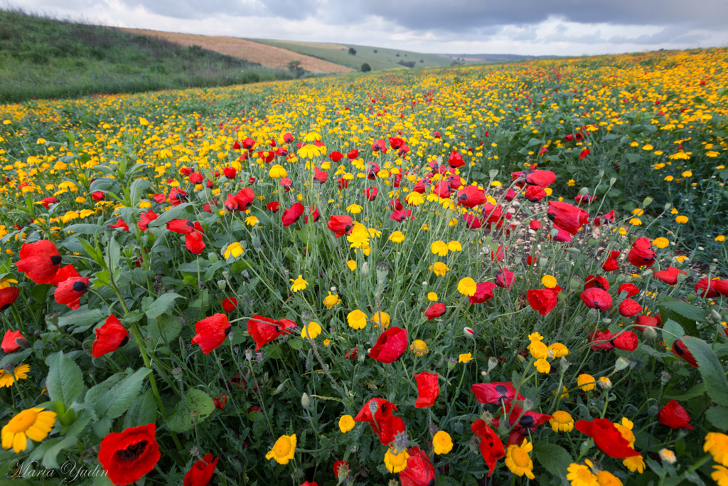 Colourful morning. Israel. Poppies field near kibbutz Dalia